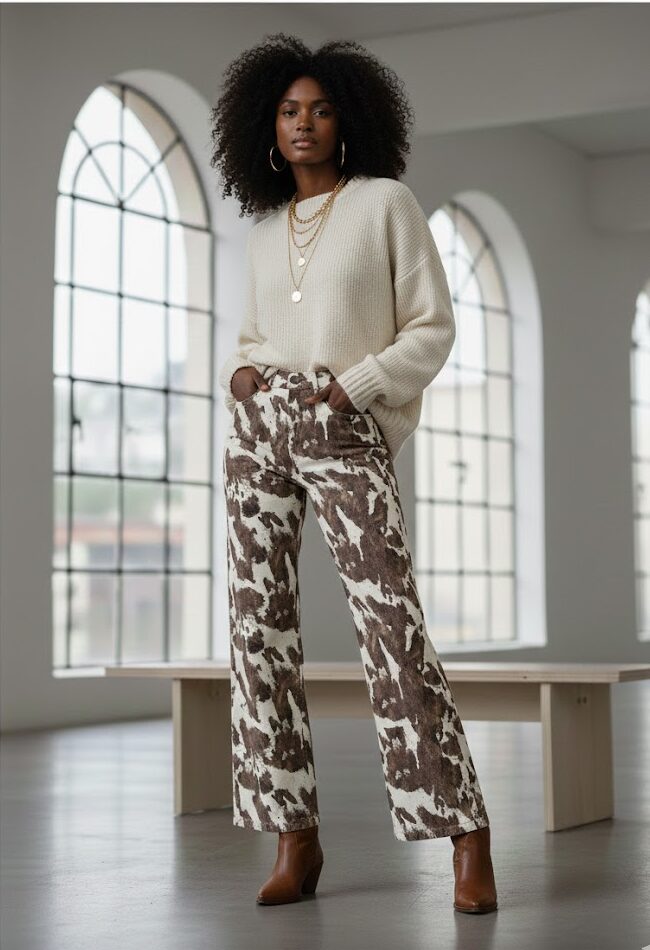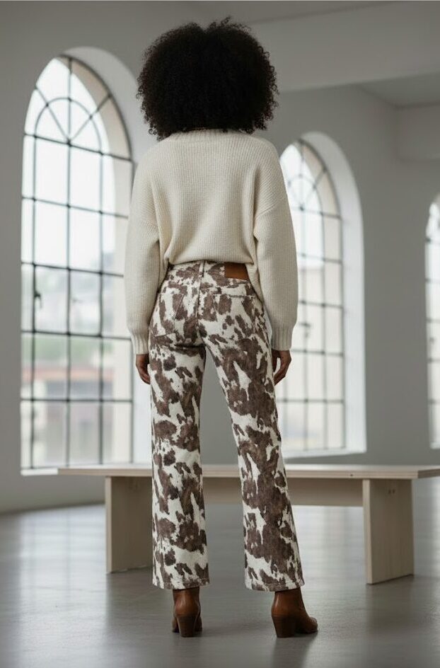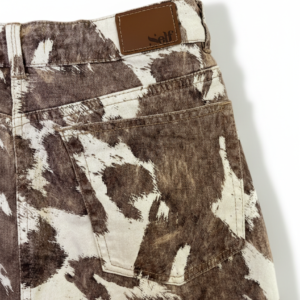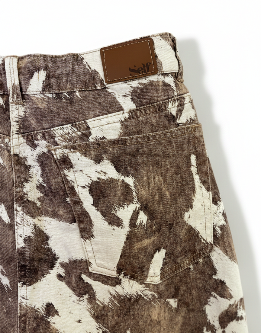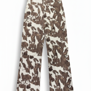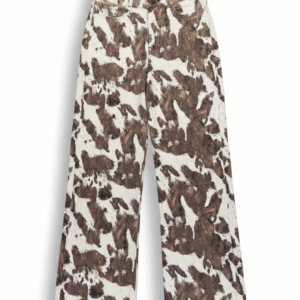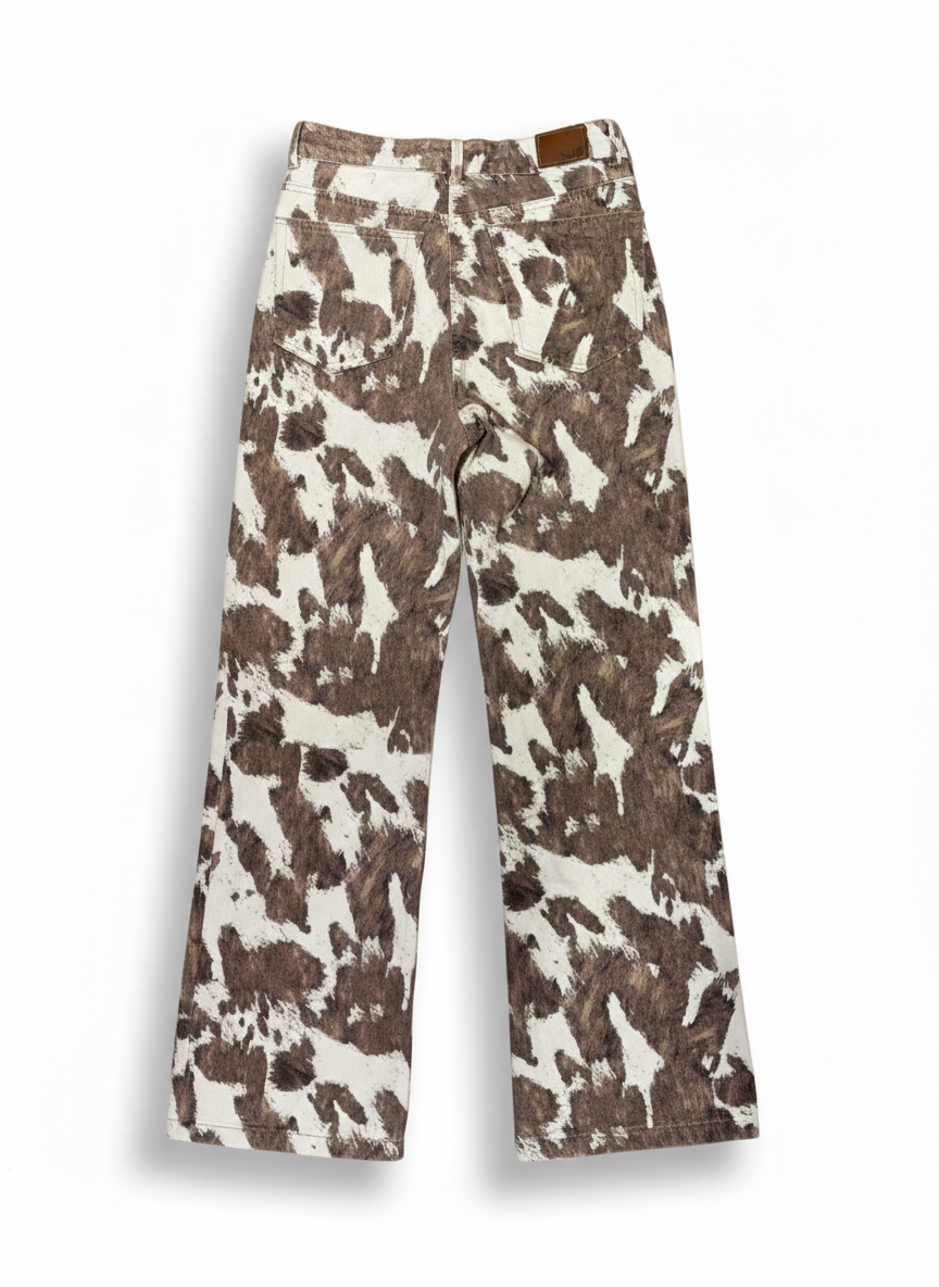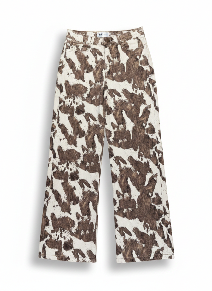 Jean tiro alto con silueta wide leg y ruedo amplio. Confeccionado con los clásicos cinco bolsillos y cierre frontal con cremallera y botón metálico. Presenta estampación digital textil en animal print, logrando un acabado definido y de alta durabilidad.