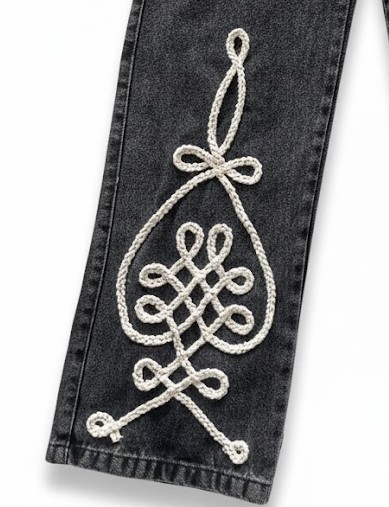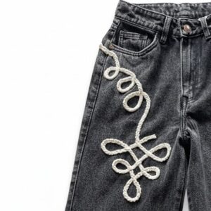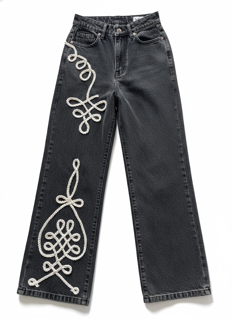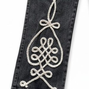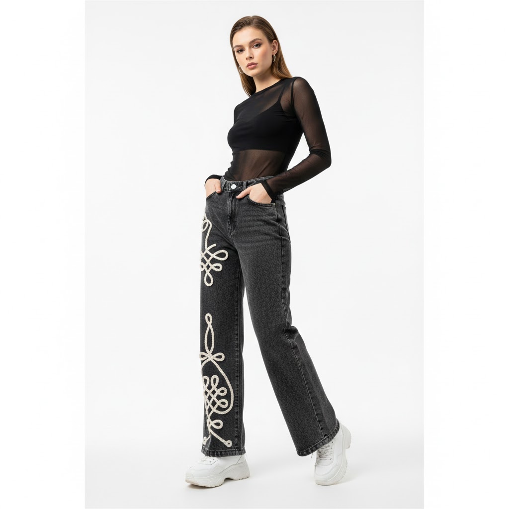 Jean Julia. Tiro alto y silueta wide leg de pierna amplia. Confeccionado en denim gris humo con cinco bolsillos y cierre frontal con cremallera y botón metálico. Incluye aplique decorativo en cordón blanco sobre las piernas, que aporta contraste y un acabado distintivo.